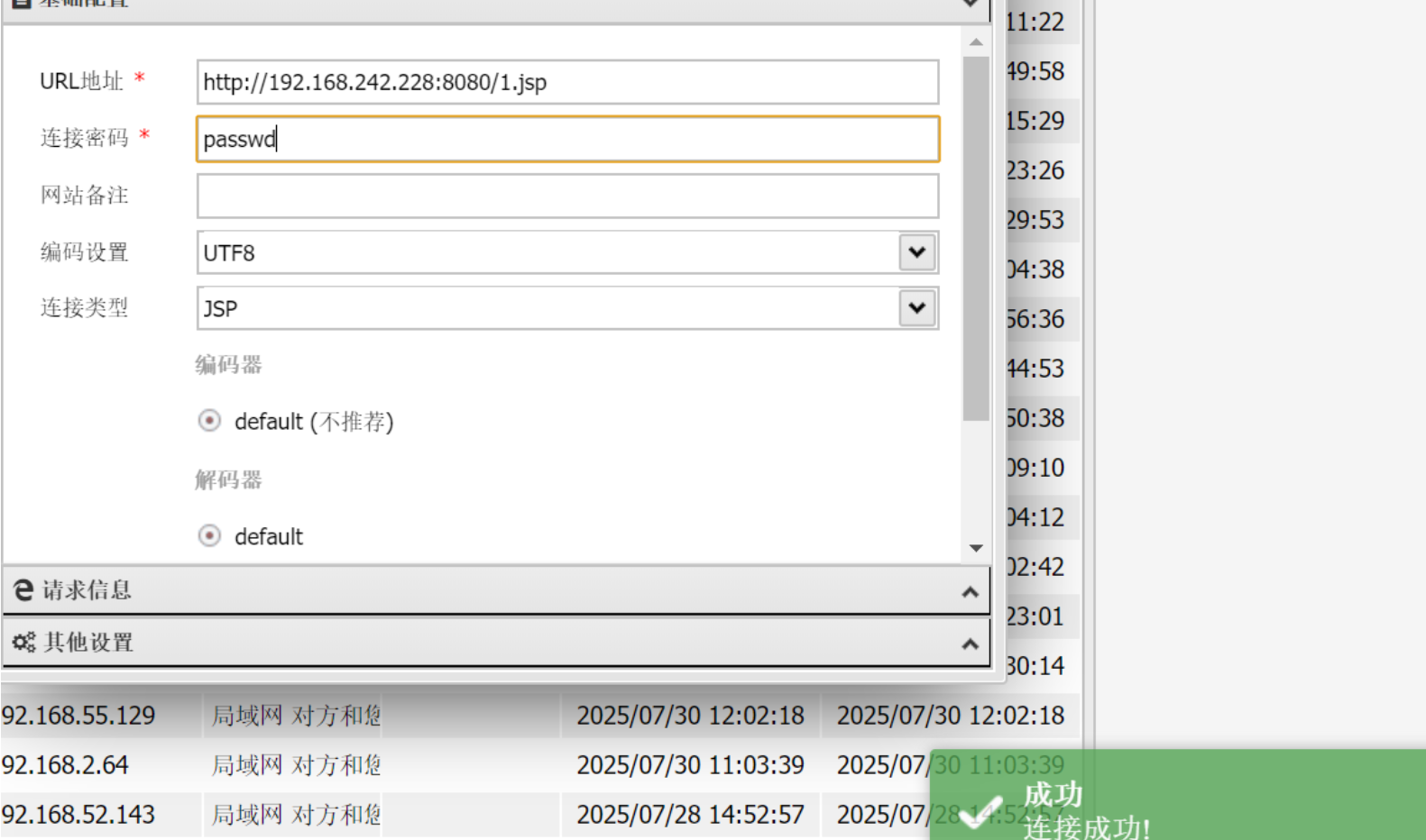 接下来修改 1.jsp 文件内容,使用 bp 抓包修改请求头, 继续利用 PUT 方法写入 jsp 木马。上传成功后利用工具进行连接。