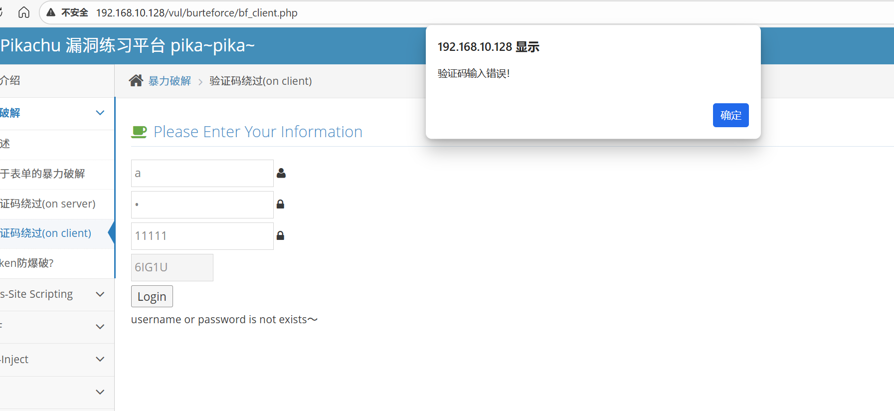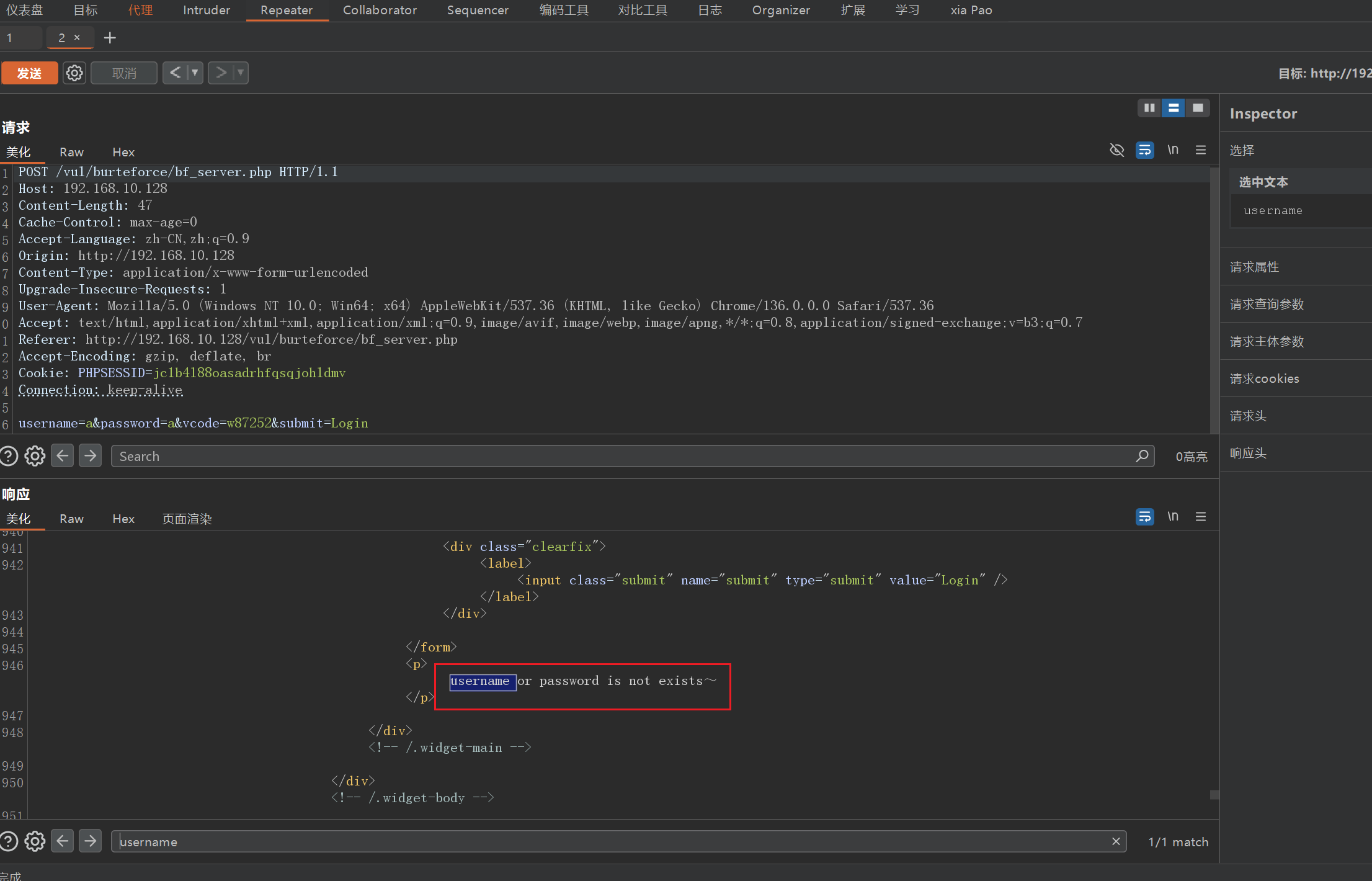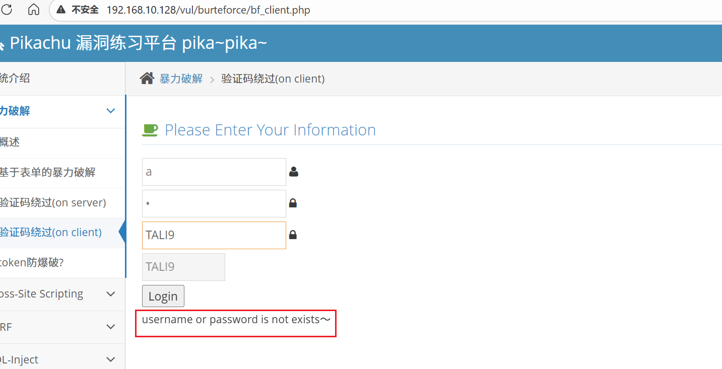 这一关首先输入正确的验证码,账号密码随便填,然后 bp 抓包,发送到 Repeater 模块重复发包。发现验证码参数一直有效。提示 username or password is not exists,只要页面不刷新,验证码就不会改变,那我们只需要输入一次正确的验证码,然后和第一关一样抓包进行爆破就行了。