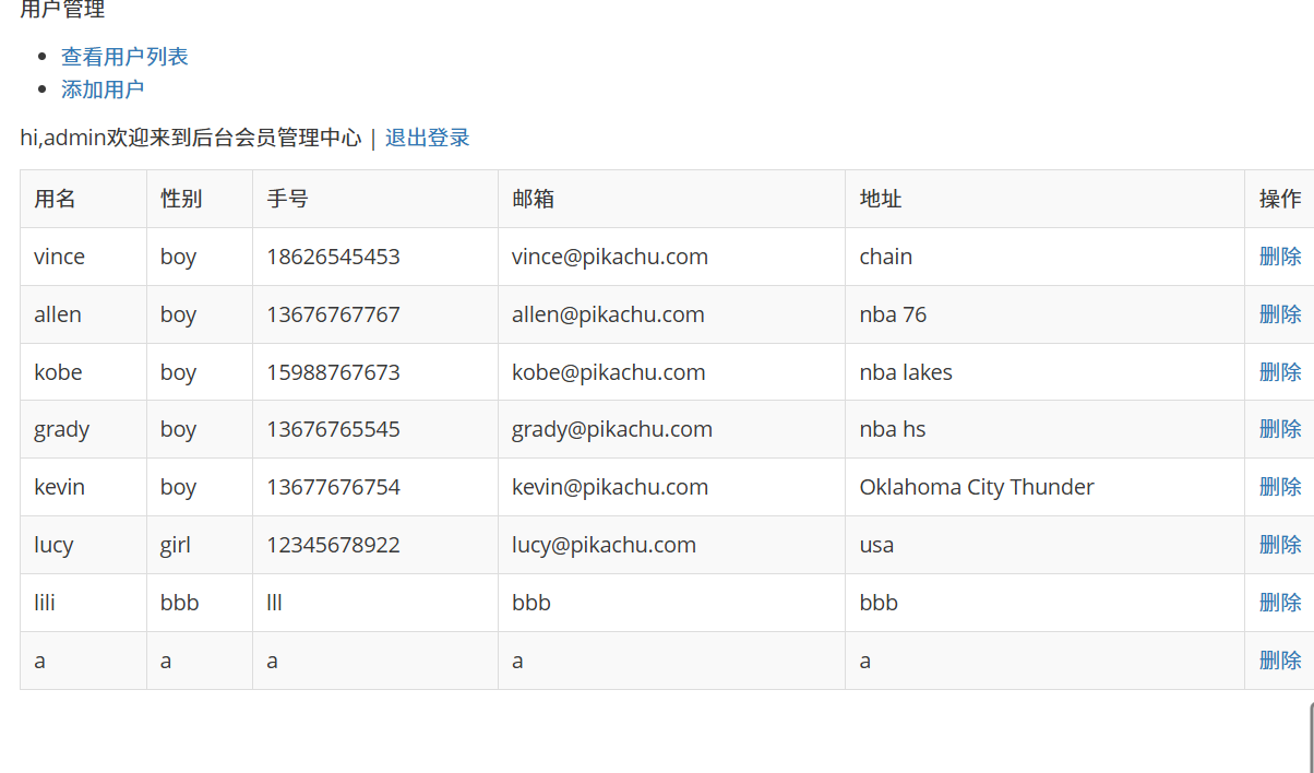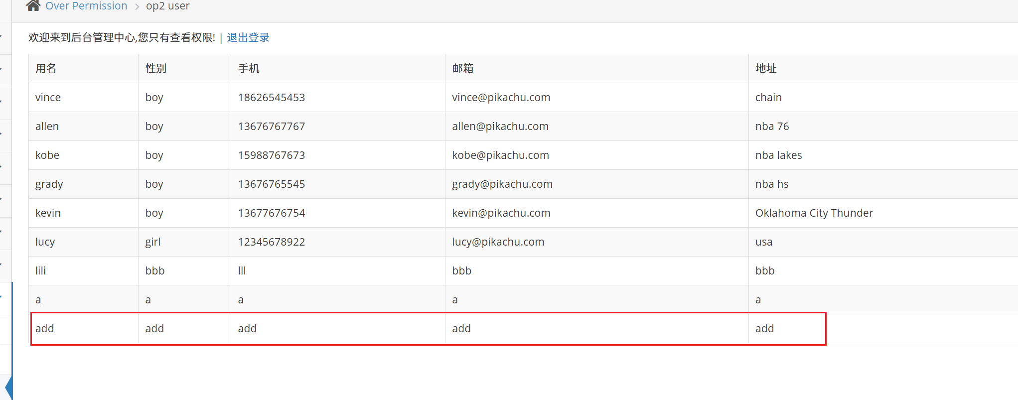 我们登录上 pikachu 的账号直接访问添加用户的页面,发现也能访问,添加用户看能不能成功,发现成功。