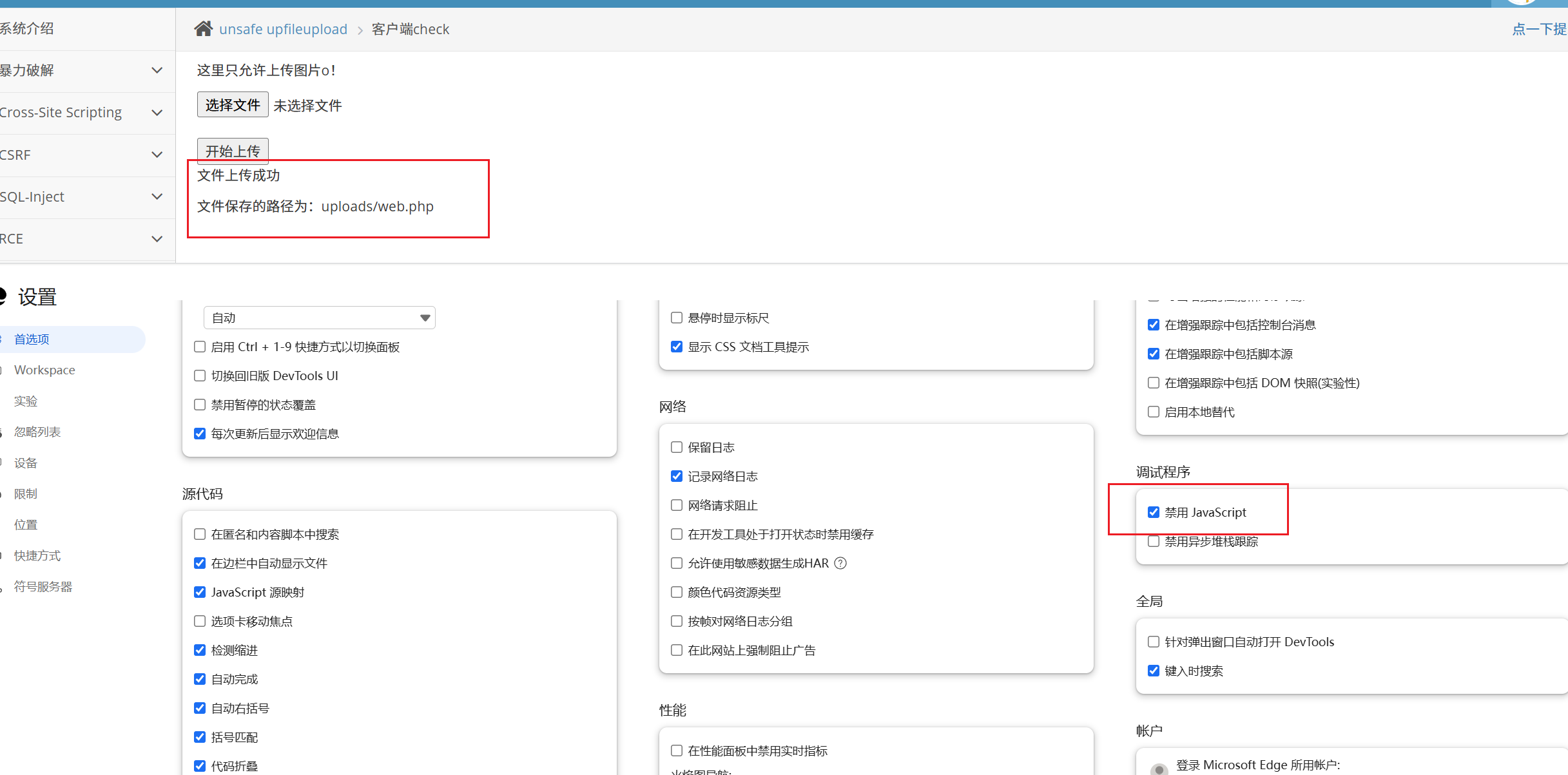 这里有两种方法可以绕过,一种直接禁用 JavaScript,就可以绕过前端检查,另一种先将后缀改为 jpg,然后 BurpSuite 改回 php 后缀就行。这里我直接禁用 JavaScript 了,更方便一点。