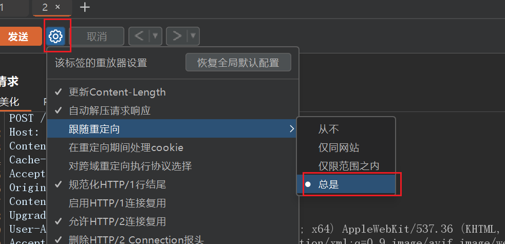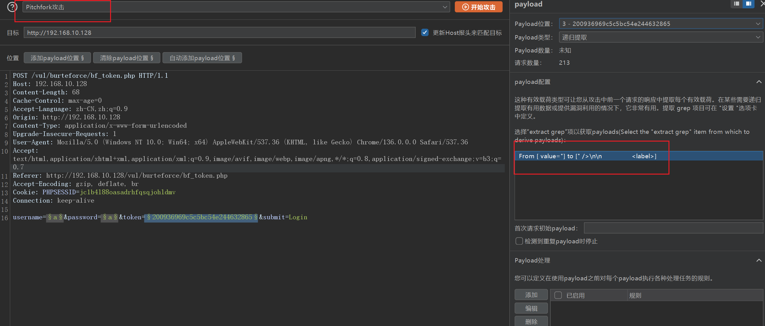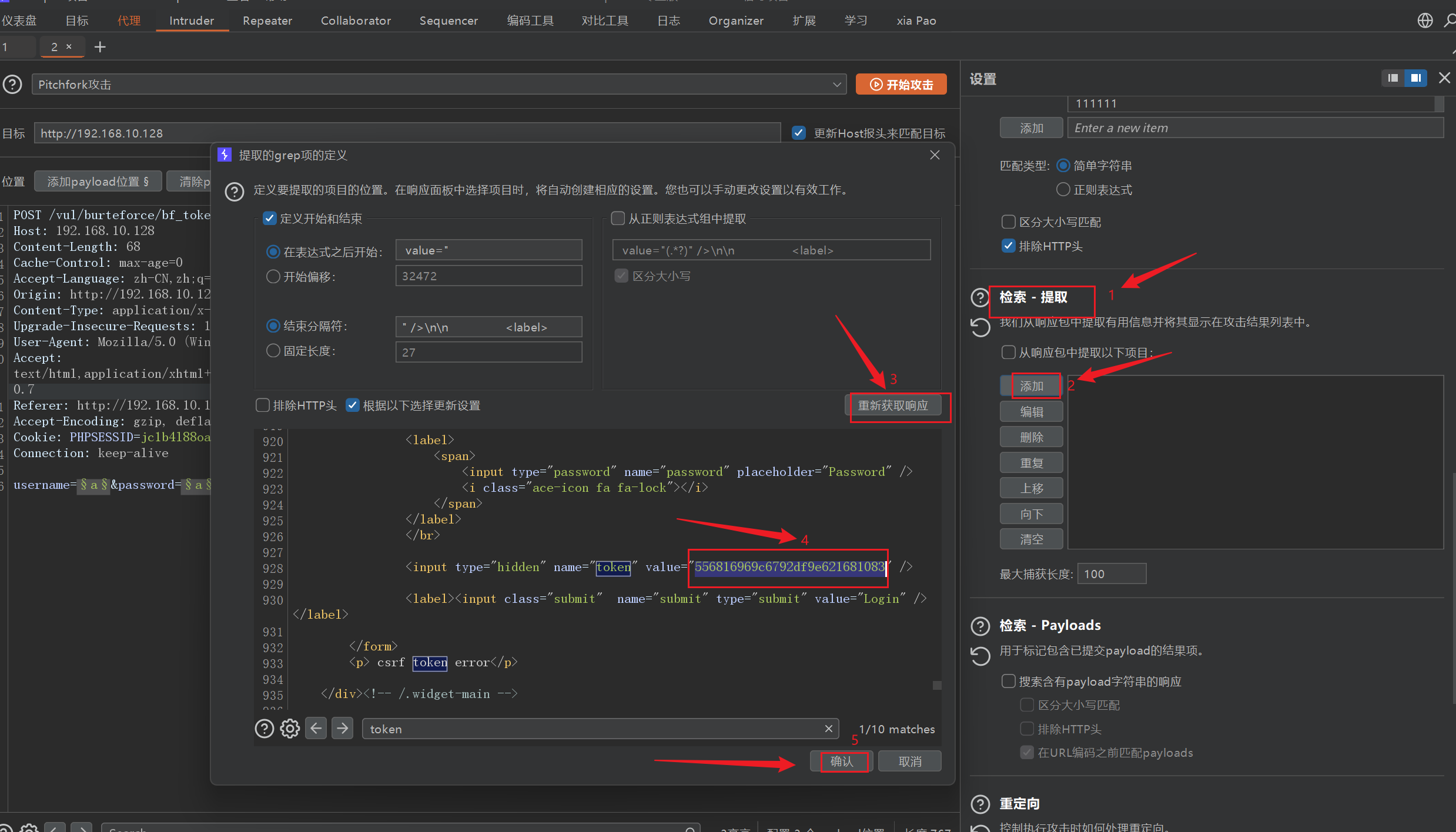 我们抓包发送到攻击模块,payload1,payload2 设置同第一关的设置,payload3 是 token 字段,设置为递归提取,不过先要在设置里添加检索。