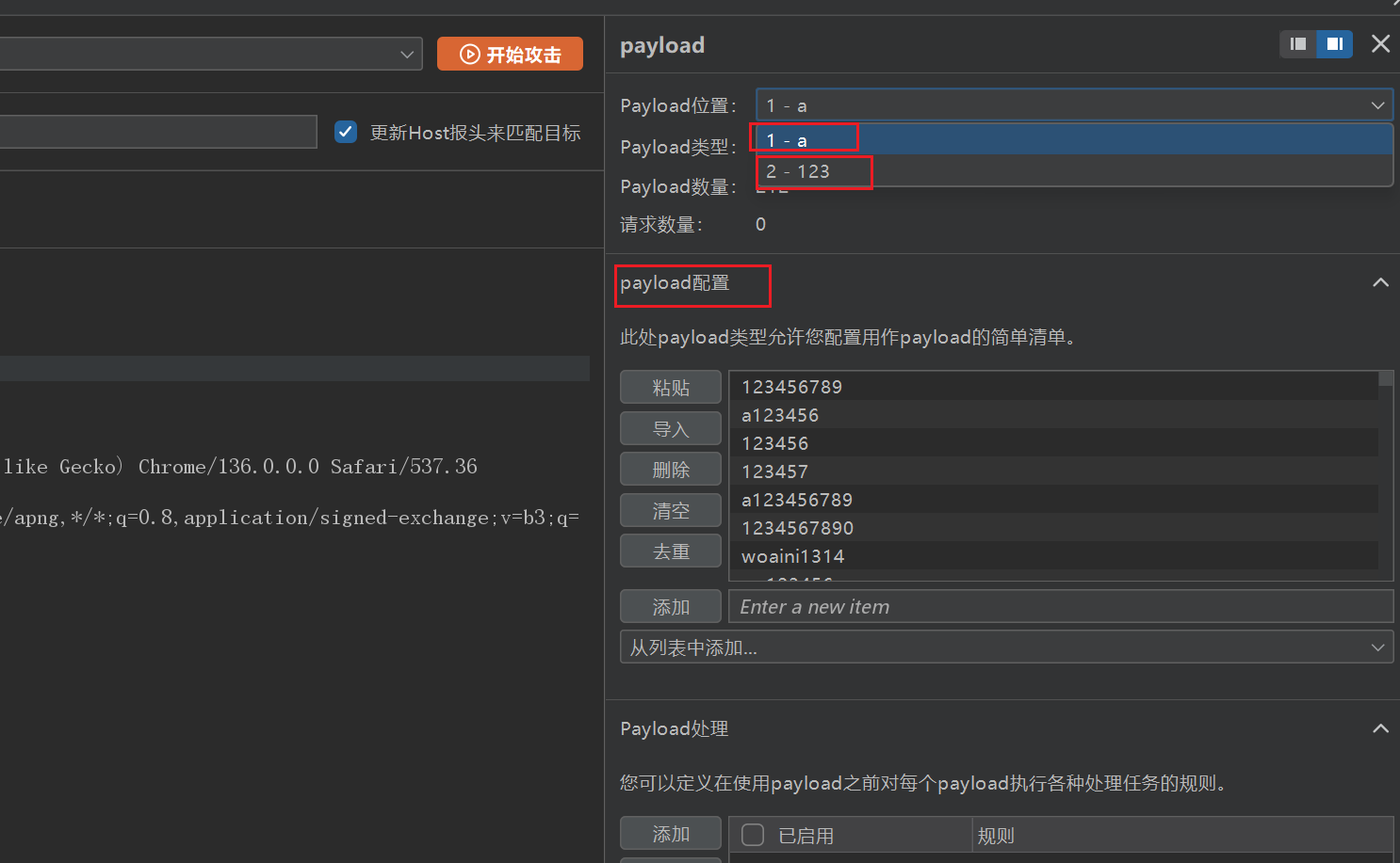 配置好以后,payload 处会出现我们刚配置的检索。注意:这里的攻击类型选择 Pitchfork(音叉) 攻击。攻击类型为音叉的时候,例如你要爆破账号和密码,你的账号字典为 123,456;你的密码字典为 147,258。那么你爆破的次数就为 2 次了,分别是 (123,147),(456,258),也就是说账号字典和密码字典是一一对应的。