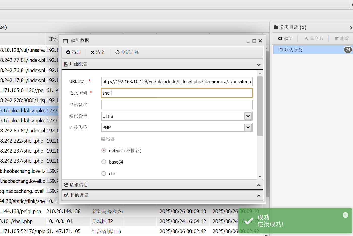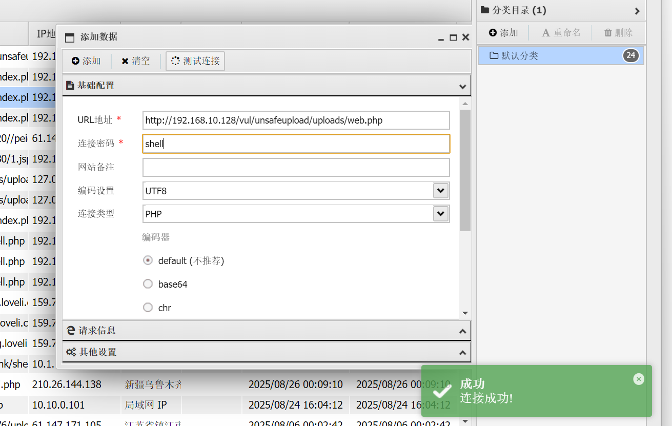 文件上传成功,接下来一样用蚁剑连接就行。