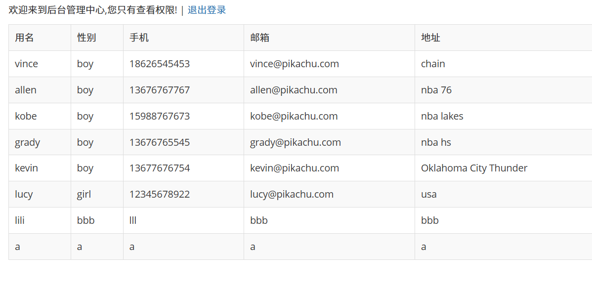 提示:这里有两个用户 admin/123456,pikachu/000000,admin 是超级 boss