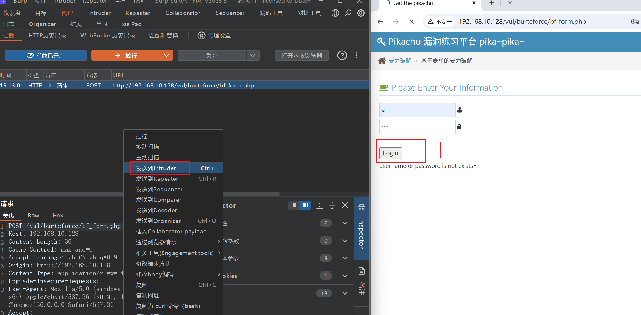 首先随便输个账号密码,抓取数据包,发送到Intruder模块,进行爆破。