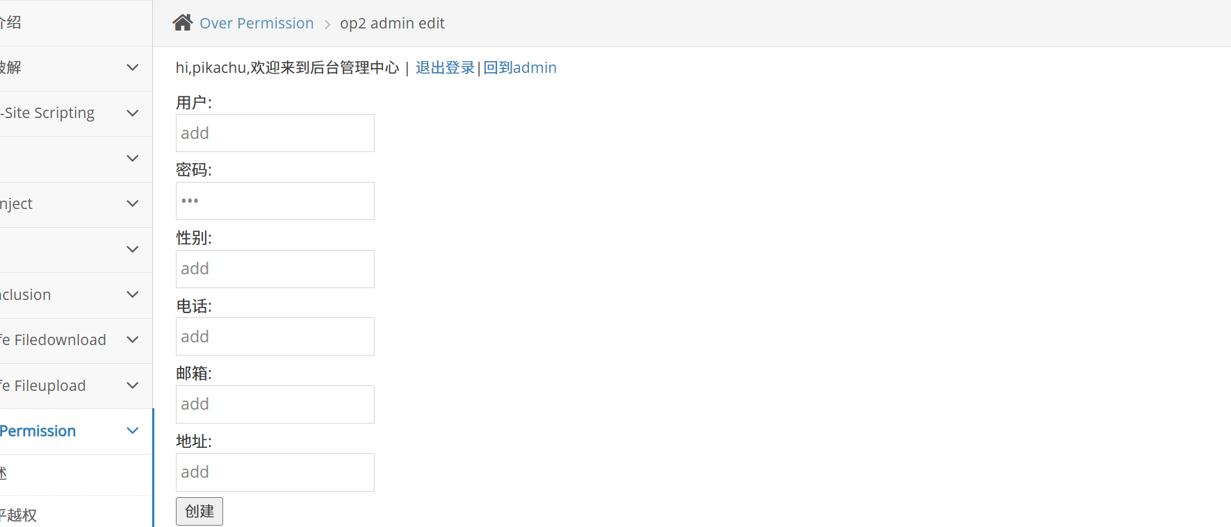 发现多了一个添加用户的功能,添加用户功能的页面是 /op2_admin_edit.php,如果 pikachu 用户也能访问这个页面,那么就越权成功。