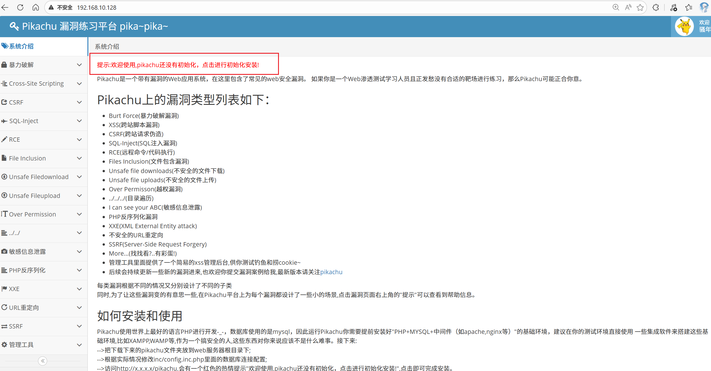docker run -d -p 80:80 --name pikachu swr.cn-north-4.myhuaweicloud.com/ddn-k8s/docker.io/area39/pikachu:latest运行之后,输入 ifconfig 命令查看虚拟机 IP,访问对应端口就行,我们这里设置的是 80 端口,直接访问 IP 就行。